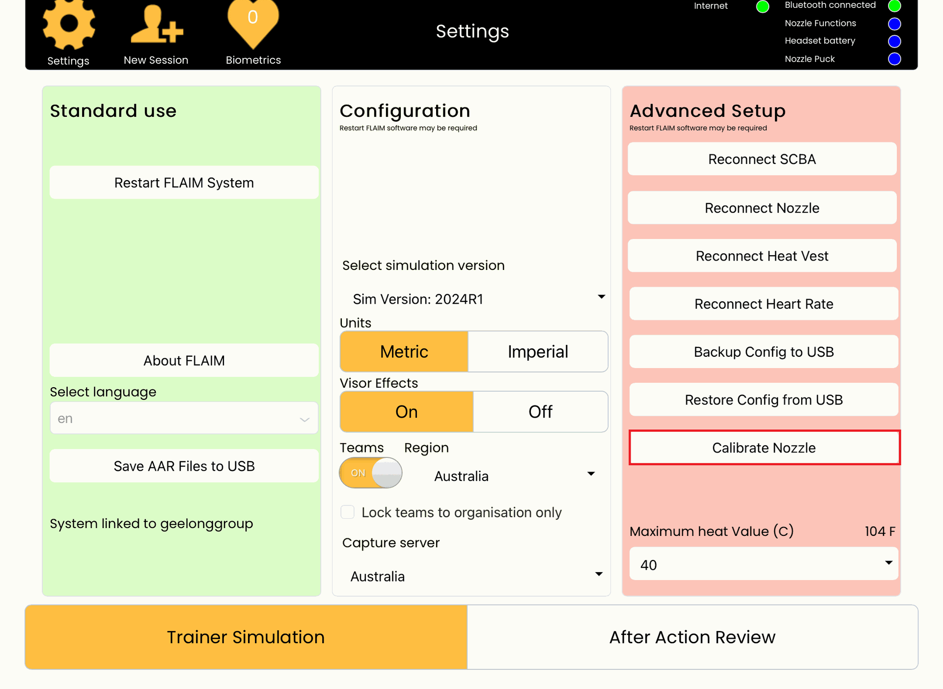 - Once completed, press the Restart FLAIM System button under 'Standard use'. This saves all changes to the system. Then, select the Trainer Simulation button in the bottom left corner to return to the main facilitator view.