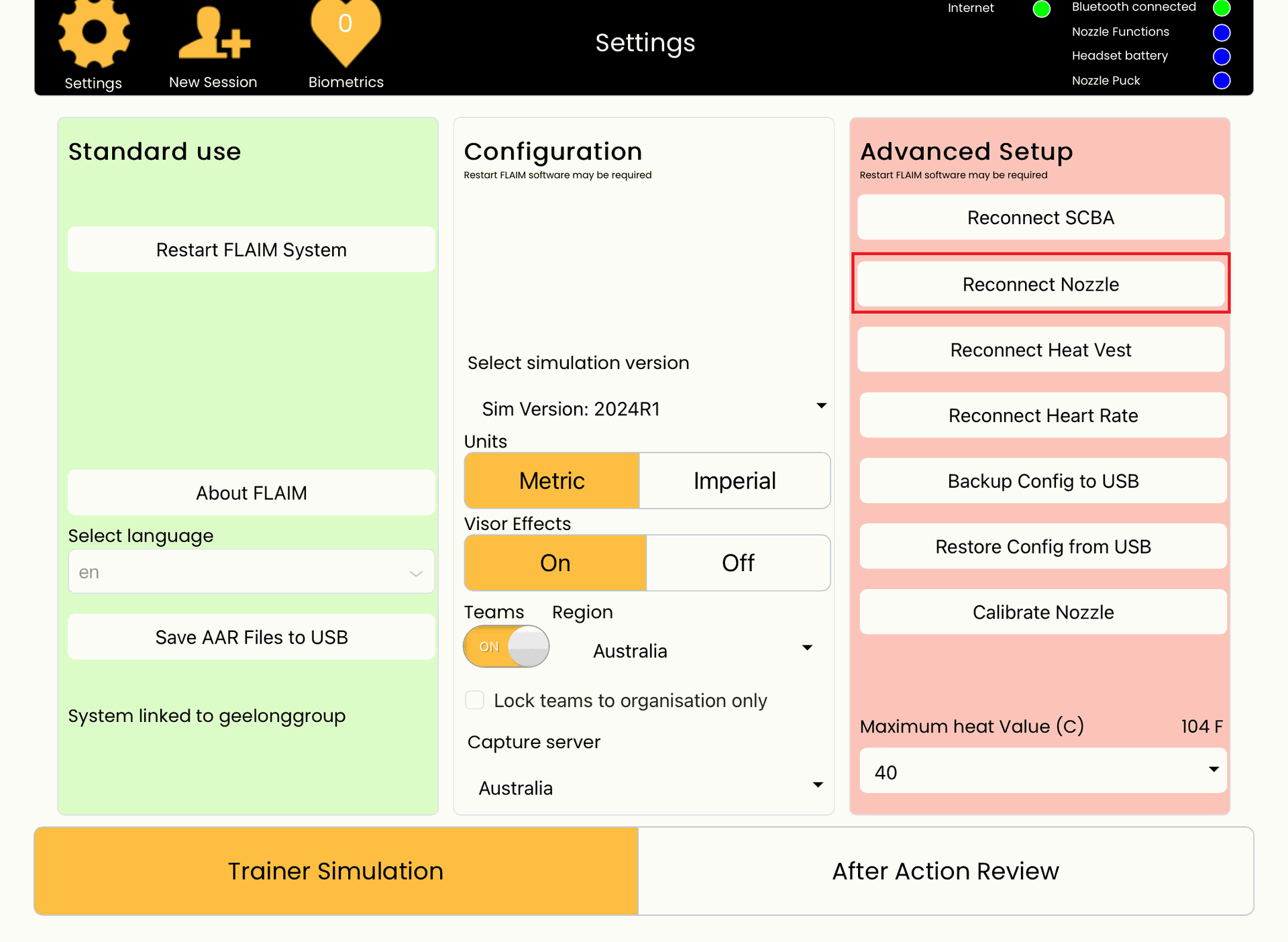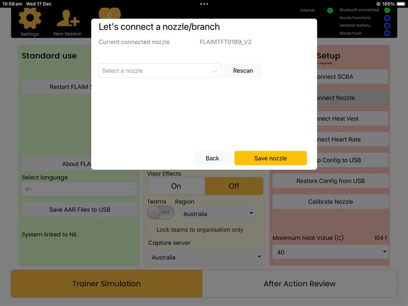 - Select the Restart FLAIM System button under 'Standard Use' on the left hand side. This confirms all updates to the system. Then press the Trainer Simulation box in the bottom left hand corner to return to the main iPad screen.